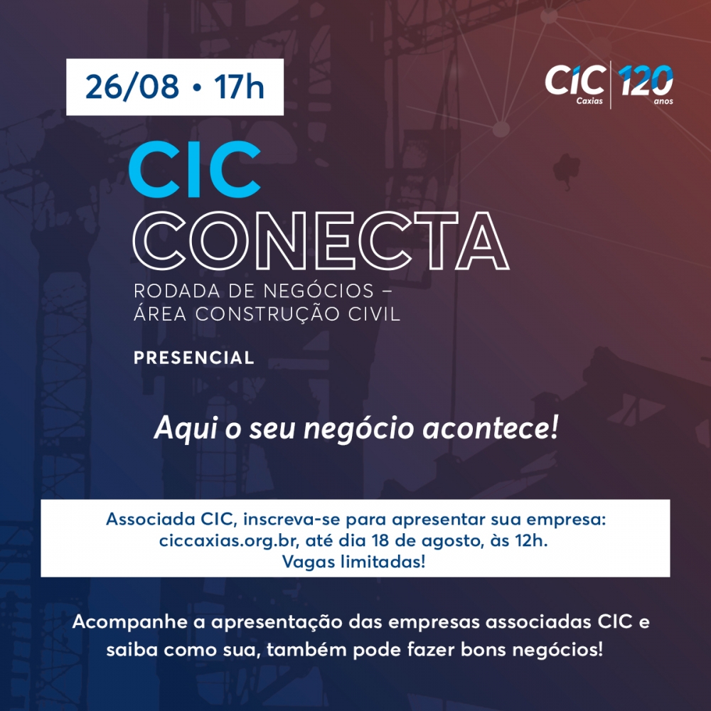 No dia 26 de agosto, às 17h, a Câmara de Indústria, Comércio e Serviços de Caxias do Sul (CIC Caxias) realiza a 14ª edição do CIC Conecta – Construção Civil, evento no formato de rodadas de negócios. O objetivo principal é reunir quem quer vender com quem quer comprar, incentivando parcerias e negócios.