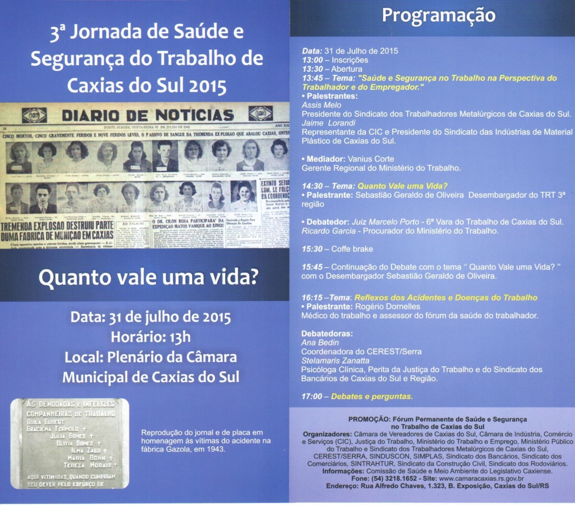 Amanha, dia 31 de julho, a partir das 13 horas no Plenário da Câmara Municipal de Caxias do Sul, ocorre a 3ª Jornada de Saúde e Segurança do Trabalho de Caxias do Sul.