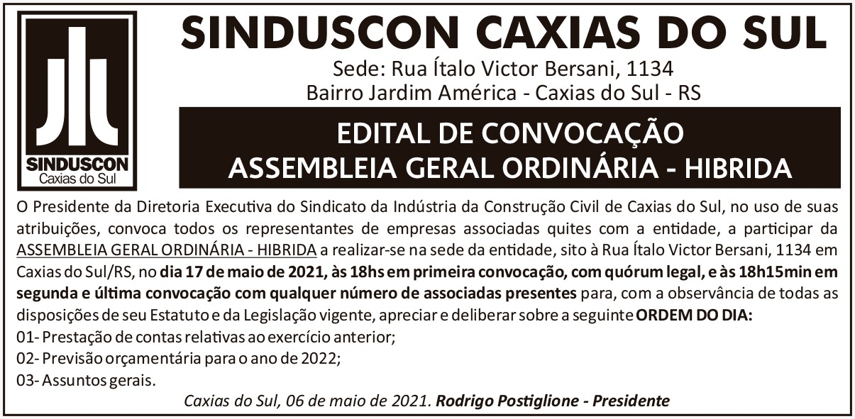 O Sinduscon Caxias convida todos os representantes das empresas da categoria (sócios e não sócios) a participar das Assembléias da entidade, conforme os editais anexados, no dia 17 de Maio de 2021, a partir das 17 horas.