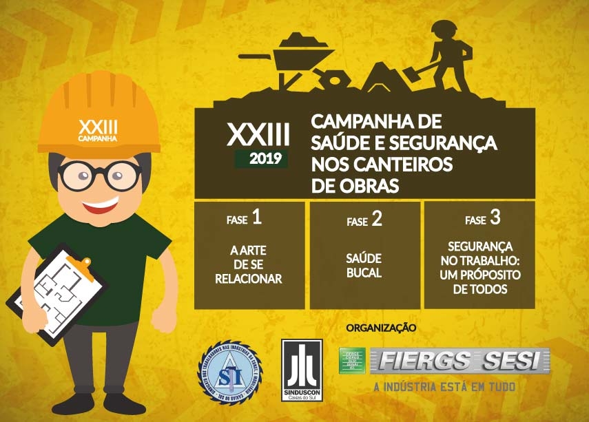 De 02 de abril a 31 de outubro, o SINDUSCON CAXIAS, em parceria com o SESI e o Sindicato dos Trabalhadores nas indústrias da Construção Civil de Caxias do Sul, realiza a XXII Campanha de Saúde e Segurança nos Canteiros de Obras.Nesta edição, serão três fases que contemplam os seguintes assuntos: