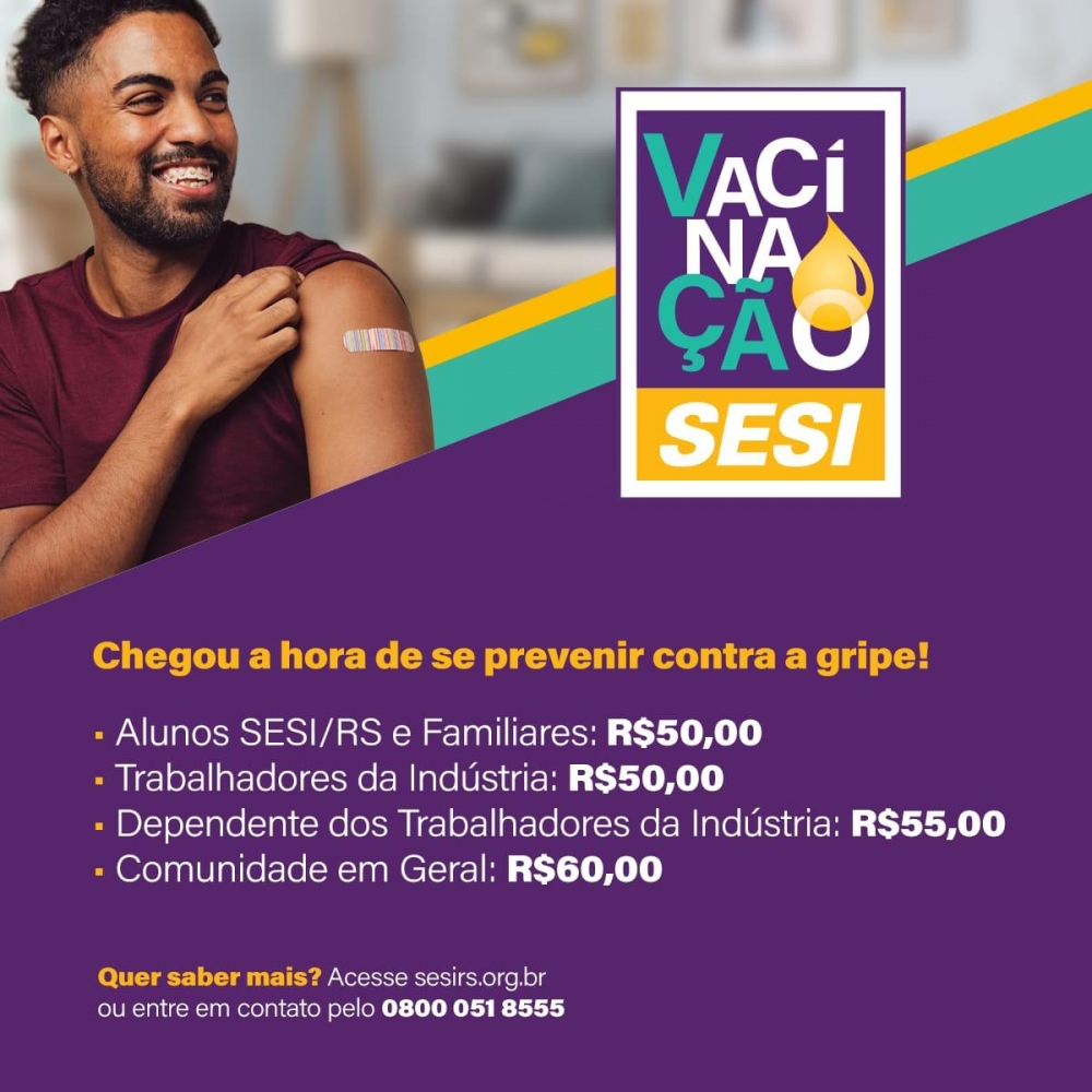 Para mais informações, fale com o SESI pelo e-mail campanhavacinacao@sesirs.org.br ou pelo telefone 0800 051 8555.