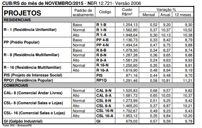 O Sinduscon Caxias divulgou hoje, dia 1º de dezembro CUB/m² – Custo Unitário Básico por metro quadrado de construção do mês de novembro de 2015.