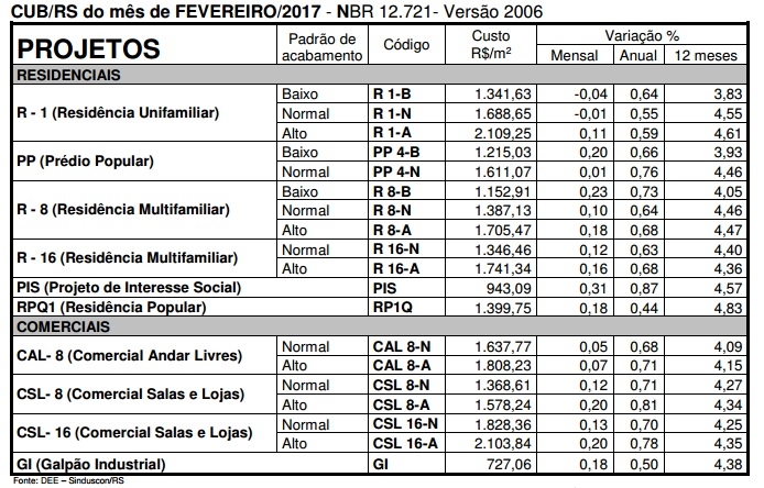 O Sinduscon Caxias divulgou, dia 02 de Março o CUB/m² – Custo Unitário Básico por metro quadrado de construção do mês de Fevereiro 2017.