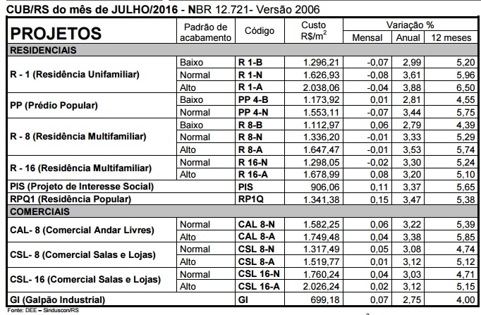 O Sinduscon Caxias divulgou, dia 01 de julho o CUB/m² – Custo Unitário Básico por metro quadrado de construção do mês de Agosto de 2016.