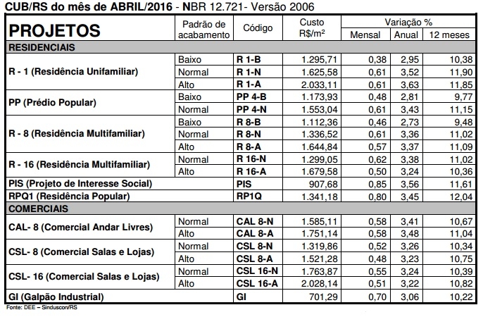 O Sinduscon Caxias divulgou, dia 2 de maio CUB/m² – Custo Unitário Básico por metro quadrado de construção do mês de abril de 2016.