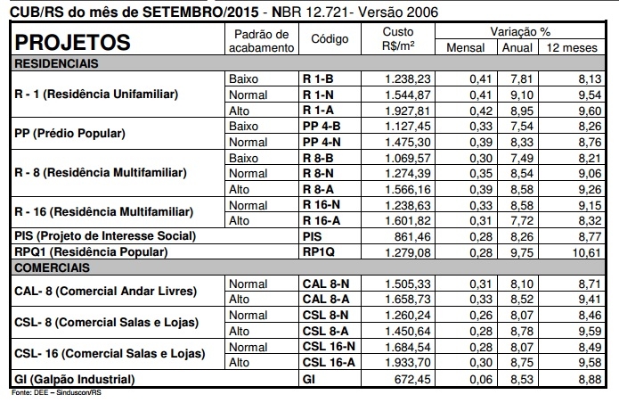 O Sinduscon Caxias divulgou hoje, dia 1º de outubro CUB/m² – Custo Unitário Básico por metro quadrado de construção do mês de setembro de 2015. Acesse a tabela de valores no link: http://goo.gl/0bfjkP