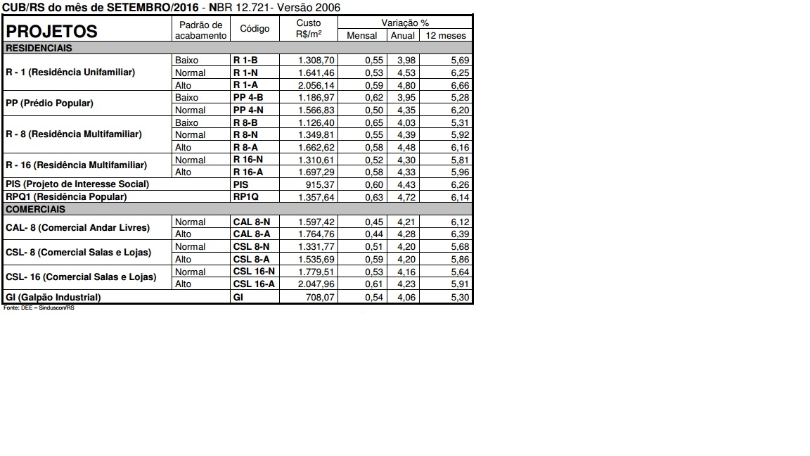 O Sinduscon Caxias divulgou, dia 01 de Outubro o CUB/m² – Custo Unitário Básico por metro quadrado de construção do mês de Setembro de 2016.