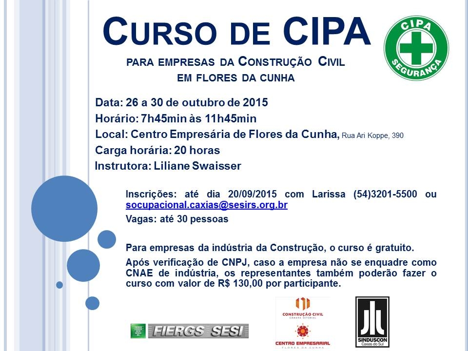 O Sinduscon Caxias, juntamente com o Sesi e o Centro Empresarial de Flores da Cunha promovem um curso de CIPA para empresas da Construção Civil de 26 a 30 de Outubro em Flores da Cunha. Inscrições pelo e-mail socupacional.caxias@sesirs.org.br