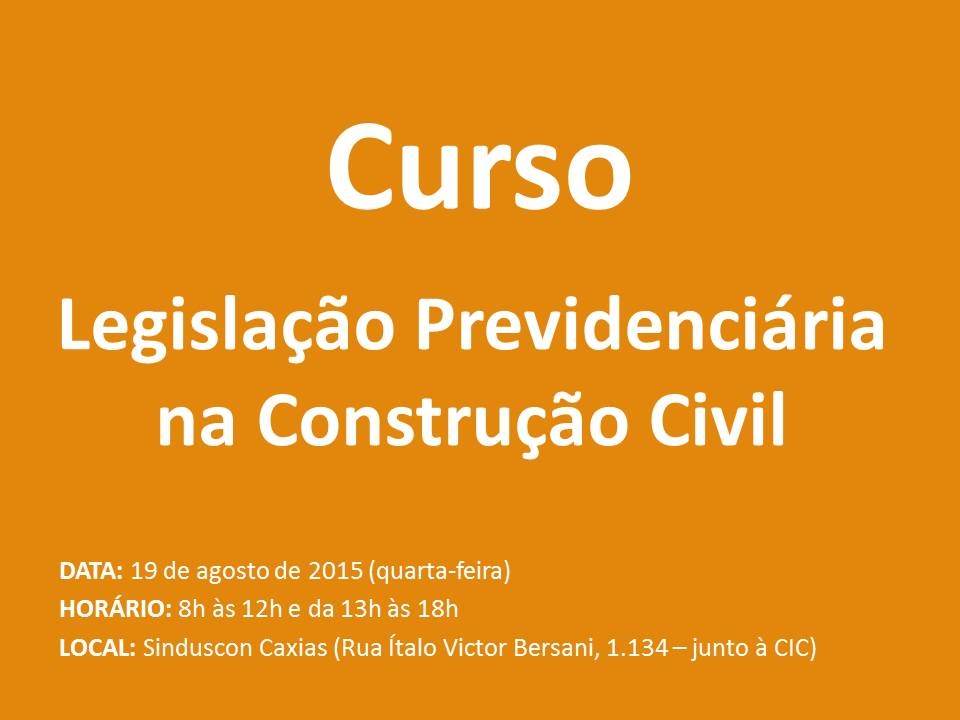 Obs.: O cancelamento da inscrição será aceito por escrito, com 48 horas de antecedência. Após, será cobrado valor integral. O SINDUSCON CAXIAS reserva-se o direito de cancelar ou reprogramar o curso, caso o número de participantes seja insuficiente.
