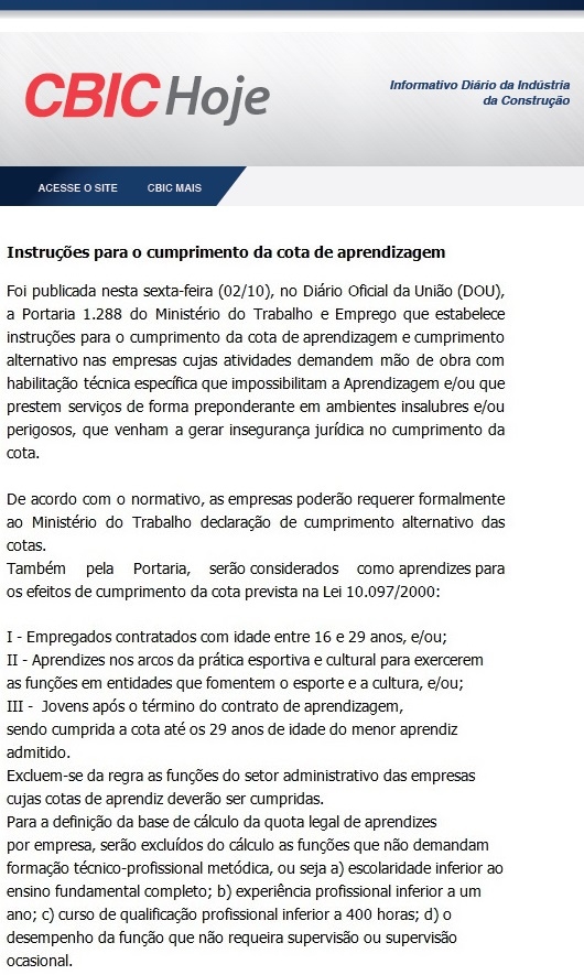 Foi publicada nesta sexta-feira (02/10), no Diário Oficial da União (DOU), a Portaria 1.288 do Ministério do Trabalho e Emprego que estabelece instruções para o cumprimento da cota de aprendizagem e cumprimento alternativo nas empresas cujas atividades demandem mão de obra com habilitação técnica específica que impossibilitam a Aprendizagem e/ou que prestem serviços de forma preponderante em ambientes insalubres e/ou perigosos, que venham a gerar insegurança jurídica no cumprimento da cota.