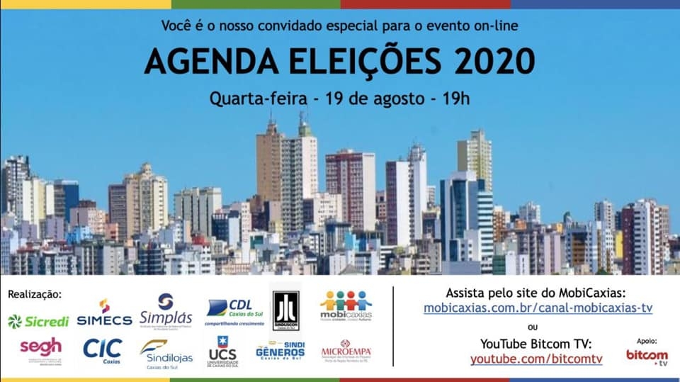 Nesta quarta-feira (19-08-20) às 19:00 Hs, o MOBI CAXIAS realiza a entrega final do Projeto Especial Agenda Eleições 2020, o evento ocorrerá de forma on-line e será transmitido pelo YouTube do MobiCaxias.
