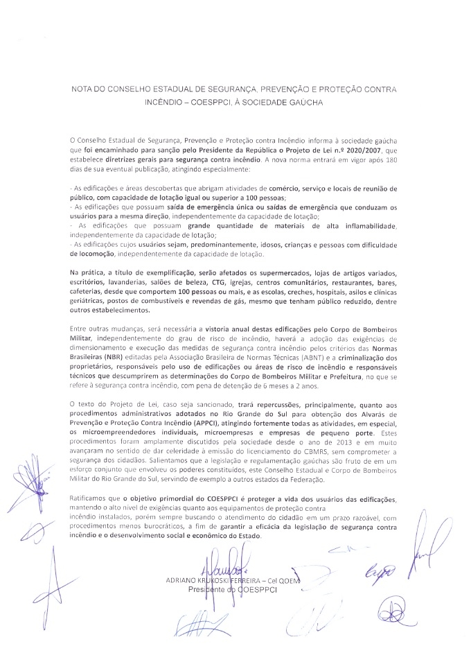 O Conselho Estadual de Segurança, Prevenção e Proteção contra Incêndio - COESPPCI, encaminhou no dia 20 de março de 2017, uma nota à imprensa sobre o Projeto de Lei nº 2020/2007, que estabelece diretrizes gerais para segurança contra incêndio, cuja qual segue abaixo para conhecimento.