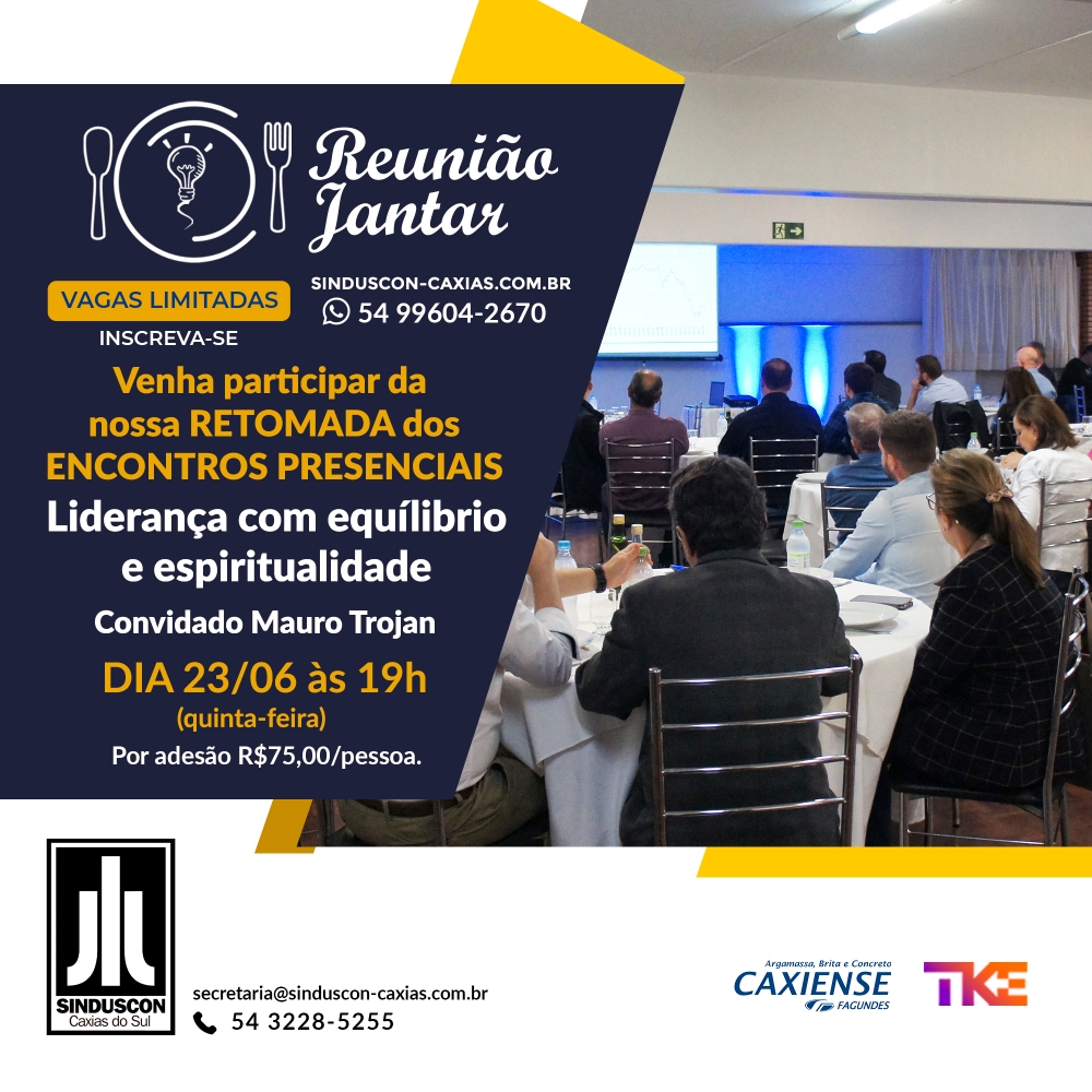 O Sinduscon Caxias retoma os encontros presenciais, dia 23 de junho, quinta-feira, no restaurante do subsolo da CIC, com início às 19 horas.