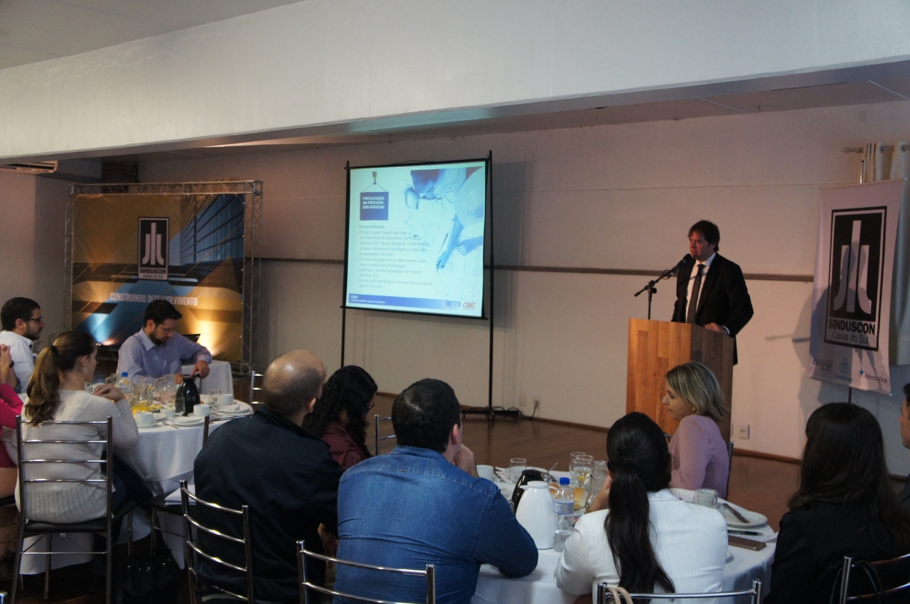 Com apresentação contundente para a área da construção civil, Fernando Guedes Ferreira Filho, advogado e Assessor Jurídico do Sinduscon Minais Gerais (MG), cativou a atenção do público durante o Café da Manhã com Palestra, promovido pelo Sindicato da Indústria da Construção Civil (SINDUSCON CAXIAS) nesta sexta-feira (07.04).