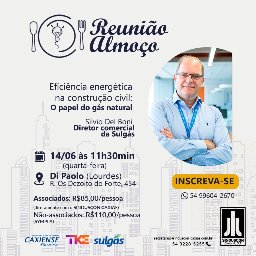 A reunião-almoço do Sinduscon Caxias do mês de junho/2023 irá abordar o tema Eficiência energética na construção civil: O papel do gás natural. O palestrante é Silvio Del Boni, diretor comercial da Sulgás, dia 14 de junho, quarta-feira, às 11h30min, no restaurante Di Paolo (Lourdes).