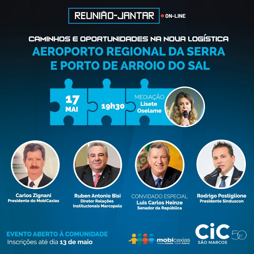 Participe da reunião-jantar on-line promovida pela CIC São Marcos, com o tema AEROPORTO REGIONAL DA SERRA E PORTO DE ARROIO DO SAL, irão debater o assunto os convidados: