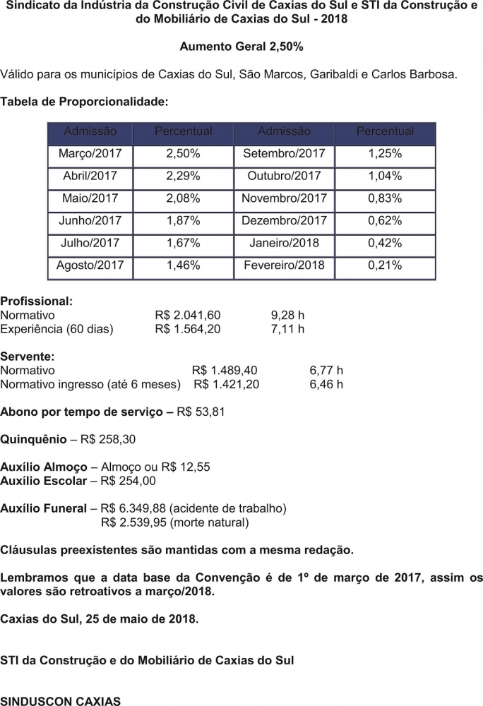Ficou acordado que o reajuste salarial geral será de 2,5% com tabela de proporcionalidade, ou seja, o percentual integral será pago aos profissionais já contratados até março de 2017, variando, posteriormente, a cada mês até 0,21% para os contratados a partir de fevereiro de 2018.