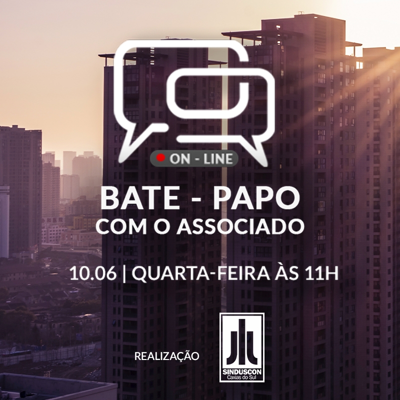 O SINDUSCON CAXIAS com o intuito de aumentar a aproximação com os associados, levar informações que possam ser utilizados no dia a dia dos empresários e fomentar o network entre todos associados, promove na próxima quarta-feira às 11h, o bate-papo com o associado. Devido às restrições ocasionadas pela pandemia de Covid -19 e para evitar a propagação do vírus, o evento será exclusivamente on-line, para participar os associados devem se cadastrar no site https://bit.ly/Bate-papo-associado-sinduscon-caxias