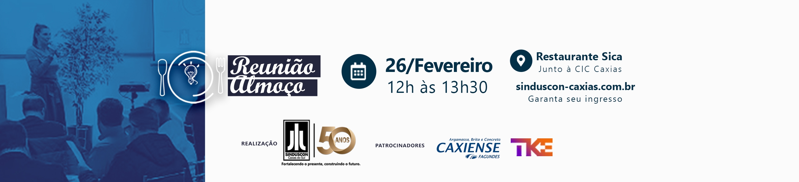 O Sindusscon Caxias convida todos os profissionais do setor para a sua primeira reunião de 2024, que abordará o tema "Soluções Caixa para o Mercado Imobiliário". O evento está programado para o dia 26 de fevereiro, a partir das 12h, e acontecerá no Restaurante Sica Subsolo, localizado junto à CIC Caxias.