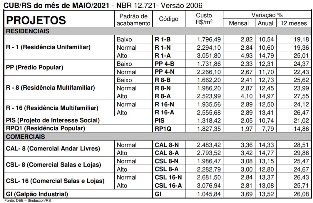 O Sinduscon-RS divulgou na última terça-feira (1º.06.2021) o CUB/m² – Custo Unitário Básico por metro quadrado de construção do mês de maio de 2021, com base na NBR 12.721/2006. Os materiais de construção que mais subiram em maio último foram: Chapa compensado plastificado 18mm (33,24%), Emulsão asfáltica impermeabilizante (12,84%), Porta lisa p/pintura (10,84%), Vidro liso transparente 4 mm (6,23%), Esquadria de correr tamanho 2,00 x 1 ,40m , em alumínio (5,39%), Aço CA-50 Ø10 mm (4,57%) e Janela de correr tamanho 1,20m x1,20m em ferro (4,36%). Já os materiais de construção que apresentaram reduções de preços no mesmo período foram: Tubo de ferro galvanizado com costura Ø 2 1/2″ (-3,12%), Fio de cobre anti-chama, Isolamento 750V,#2,5 mm2 (-2,41%), e Concreto fck=25 Mpe (-0,55%).